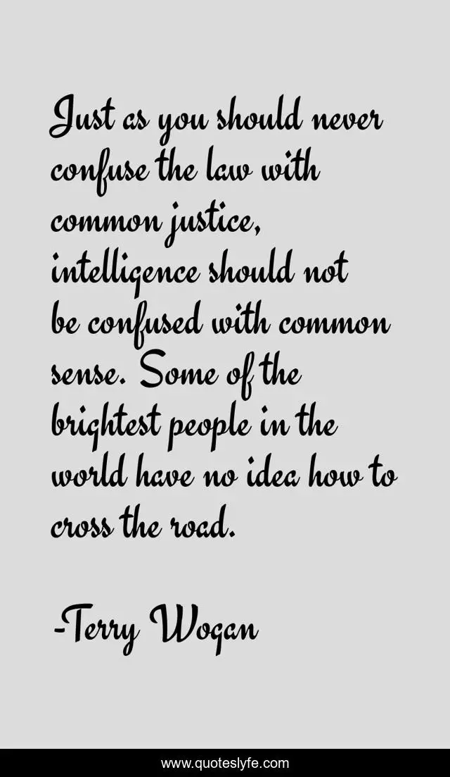 This page presents the quote "Just as you should never confuse the law with common justice, intelligence should not be confused with common sense. Some of the brightest people in the world have no idea how to cross the road.". Author of this quote is Terry Wogan. This quote is about justice, law, road,.