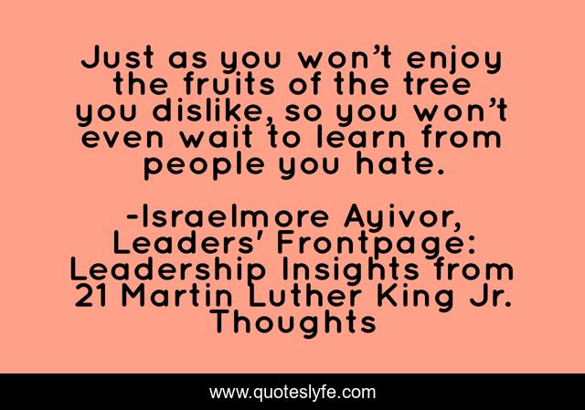 This page presents the quote "Just as you won’t enjoy the fruits of the tree you dislike, so you won’t even wait to learn from people you hate.". Author of this quote is Israelmore Ayivor, Leaders' Frontpage: Leadership Insights from 21 Martin Luther King Jr. Thoughts. This quote is about enjoy, love, leaders, martin-luther-king-jr, mlk, tree, trees, eat, martin-luther-king,.