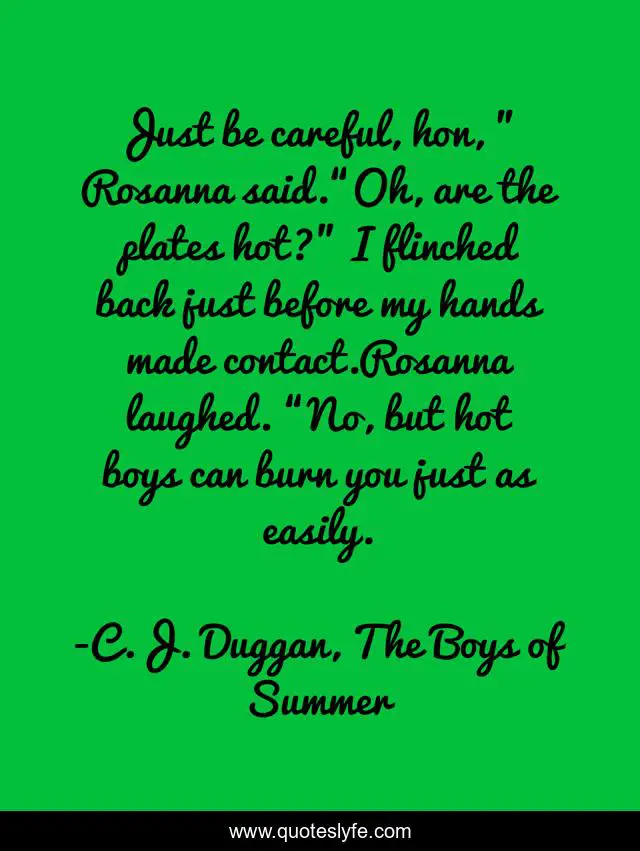 This page presents the quote "Just be careful, hon, ” Rosanna said.“Oh, are the plates hot?” I flinched back just before my hands made contact.Rosanna laughed. “No, but hot boys can burn you just as easily.". Author of this quote is C.J. Duggan, The Boys of Summer. This quote is about romance, boys, humor, young-adult, summer,.