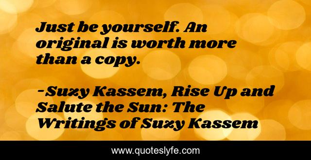 This page presents the quote "Just be yourself. An original is worth more than a copy.". Author of this quote is Suzy Kassem, Rise Up and Salute the Sun: The Writings of Suzy Kassem. This quote is about originality, superficiality, honesty, self-worth,.