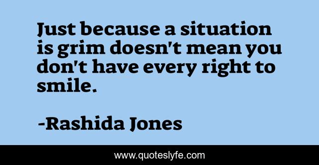 This page presents the quote "Just because a situation is grim doesn't mean you don't have every right to smile.". Author of this quote is Rashida Jones. This quote is about situation, mean,.
