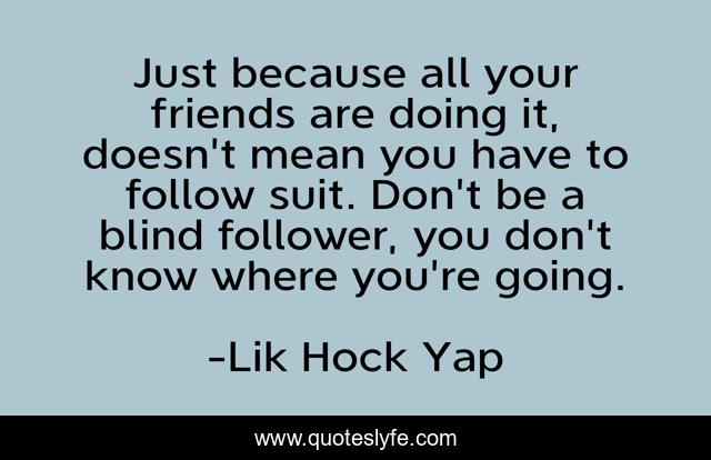 This page presents the quote "Just because all your friends are doing it, doesn't mean you have to follow suit. Don't be a blind follower, you don't know where you're going.". Author of this quote is Lik Hock Yap. This quote is about blind, wise, lost, trend, choice, inspirational, enthusiasm, friendship, thoughts,.