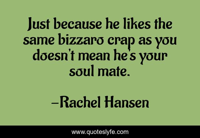 This page presents the quote "Just because he likes the same bizzaro crap as you doesn't mean he's your soul mate.". Author of this quote is Rachel Hansen. This quote is about relationships, love, soul-mate, humour, affection,.