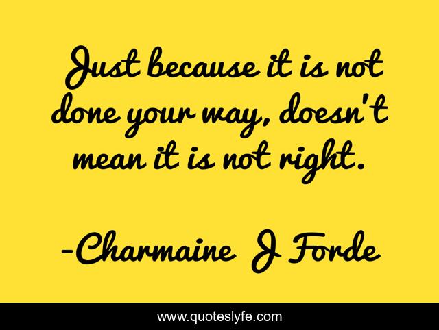 This page presents the quote "Just because it is not done your way, doesn't mean it is not right.". Author of this quote is Charmaine J Forde. This quote is about right, done, way, doesn-t,.