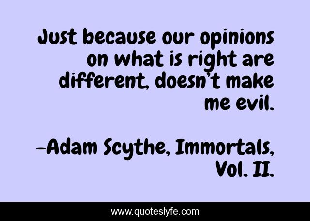 This page presents the quote "Just because our opinions on what is right are different, doesn’t make me evil.". Author of this quote is Adam Scythe, Immortals, Vol. II.. This quote is about opinion, different, good-and-evil, right,.