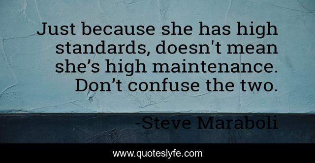 This page presents the quote "Just because she has high standards, doesn't mean she’s high maintenance. Don’t confuse the two.". Author of this quote is Steve Maraboli. This quote is about love, relationship, affection, standards,.