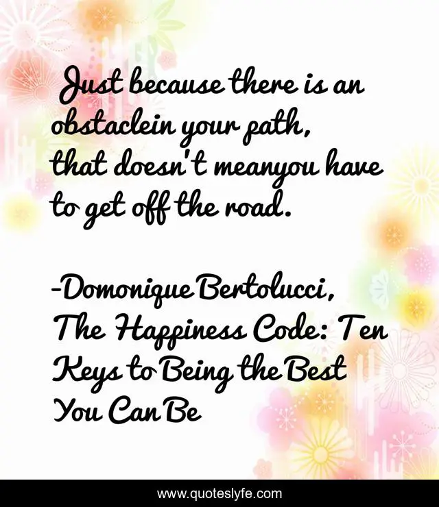 This page presents the quote "Just because there is an obstaclein your path, that doesn’t meanyou have to get off the road.". Author of this quote is Domonique Bertolucci, The Happiness Code: Ten Keys to Being the Best You Can Be. This quote is about life-coaching, motivation, how-to-be-happier, life-coach, be-happy, how-to-be-happy, happiness-advice, happiness, be-more-motivated,.
