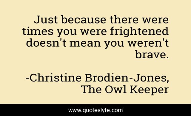 This page presents the quote "Just because there were times you were frightened doesn't mean you weren't brave.". Author of this quote is Christine Brodien-Jones, The Owl Keeper. This quote is about the-owl-keeper, brave,.