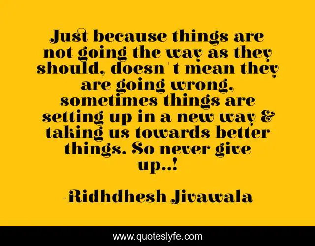 This page presents the quote "Just because things are not going the way as they should, doesn't mean they are going wrong, sometimes things are setting up in a new way & taking us towards better things. So never give up..!". Author of this quote is Ridhdhesh Jivawala. This quote is about life, success, positive, motivational, confidence, optimistic, never-give-up,.