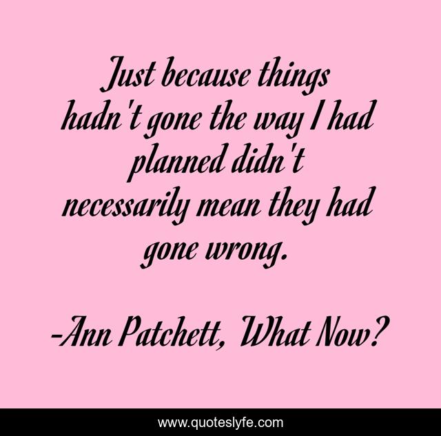 This page presents the quote "Just because things hadn't gone the way I had planned didn't necessarily mean they had gone wrong.". Author of this quote is Ann Patchett, What Now?. .