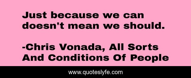 This page presents the quote "Just because we can doesn't mean we should.". Author of this quote is Chris Vonada, All Sorts And Conditions Of People. This quote is about relationships, insipration, honor, people,.