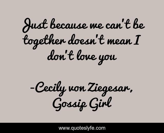 This page presents the quote "Just because we can't be together doesn't mean I don't love you". Author of this quote is Cecily von Ziegesar, Gossip Girl. This quote is about film, love-hurts,.