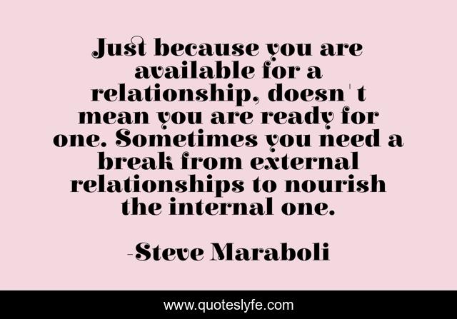 This page presents the quote "Just because you are available for a relationship, doesn't mean you are ready for one. Sometimes you need a break from external relationships to nourish the internal one.". Author of this quote is Steve Maraboli. This quote is about relationships, self-love,.