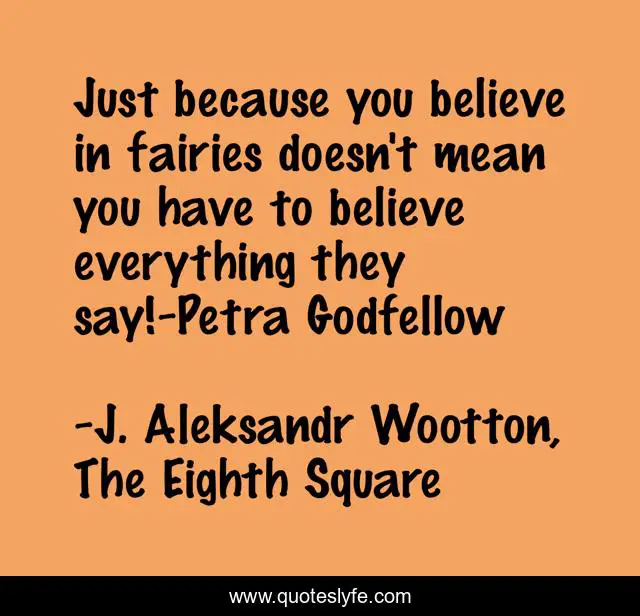 This page presents the quote "Just because you believe in fairies doesn't mean you have to believe everything they say!-Petra Godfellow". Author of this quote is J. Aleksandr Wootton, The Eighth Square. This quote is about deception, fairies,.