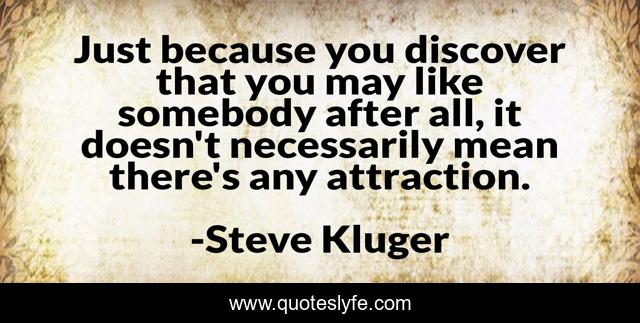 This page presents the quote "Just because you discover that you may like somebody after all, it doesn't necessarily mean there's any attraction.". Author of this quote is Steve Kluger. This quote is about relationships, attraction, liking-someone, my-most-excellent-year,.