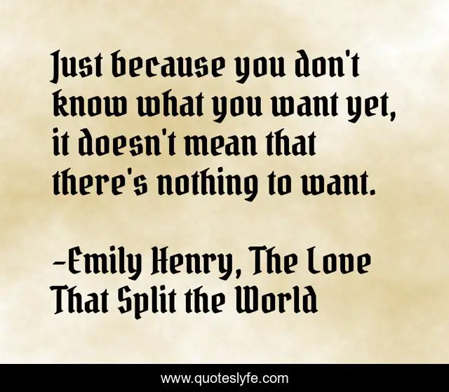 This page presents the quote "Just because you don't know what you want yet, it doesn't mean that there's nothing to want.". Author of this quote is Emily Henry, The Love That Split the World. This quote is about enthusiasm, advice, future, graduation, inspirational,.