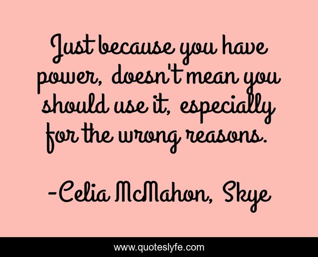 This page presents the quote "Just because you have power, doesn't mean you should use it, especially for the wrong reasons.". Author of this quote is Celia McMahon, Skye. This quote is about reasons, wrong, power,.