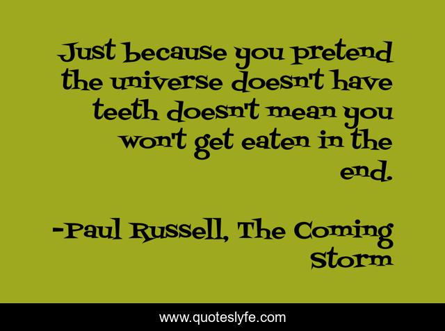 This page presents the quote "Just because you pretend the universe doesn't have teeth doesn't mean you won't get eaten in the end.". Author of this quote is Paul Russell, The Coming Storm. This quote is about life-philosophy, life,.
