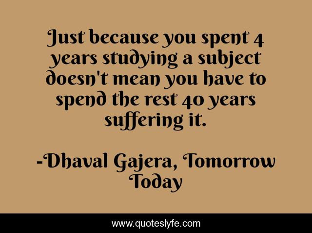 This page presents the quote "Just because you spent 4 years studying a subject doesn't mean you have to spend the rest 40 years suffering it.". Author of this quote is Dhaval Gajera, Tomorrow Today. This quote is about studying, suffering, subject,.