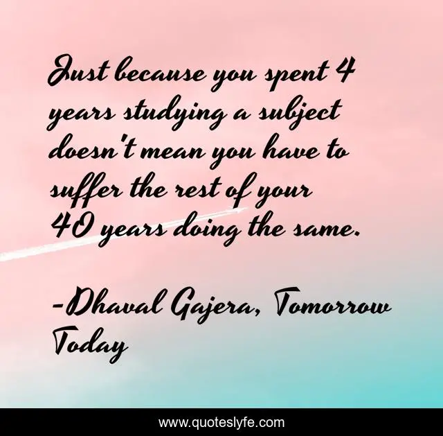 This page presents the quote "Just because you spent 4 years studying a subject doesn't mean you have to suffer the rest of your 40 years doing the same.". Author of this quote is Dhaval Gajera, Tomorrow Today. This quote is about career, life,.