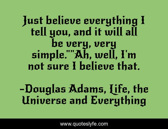 This page presents the quote "Just believe everything I tell you, and it will all be very, very simple.""Ah, well, I'm not sure I believe that.". Author of this quote is Douglas Adams, Life, the Universe and Everything. This quote is about funny, comedy,.
