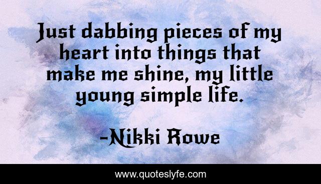 This page presents the quote "Just dabbing pieces of my heart into things that make me shine, my little young simple life.". Author of this quote is Nikki Rowe. This quote is about knowing, heart, life, words-for-her-feminine, freespirit, simplicity, authentic, zen, soul,.