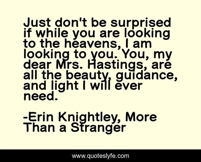 This page presents the quote "Just don't be surprised if while you are looking to the heavens, I am looking to you. You, my dear Mrs. Hastings, are all the beauty, guidance, and light I will ever need.". Author of this quote is Erin Knightley, More Than a Stranger. This quote is about sweet, astronomy, love, affection,.