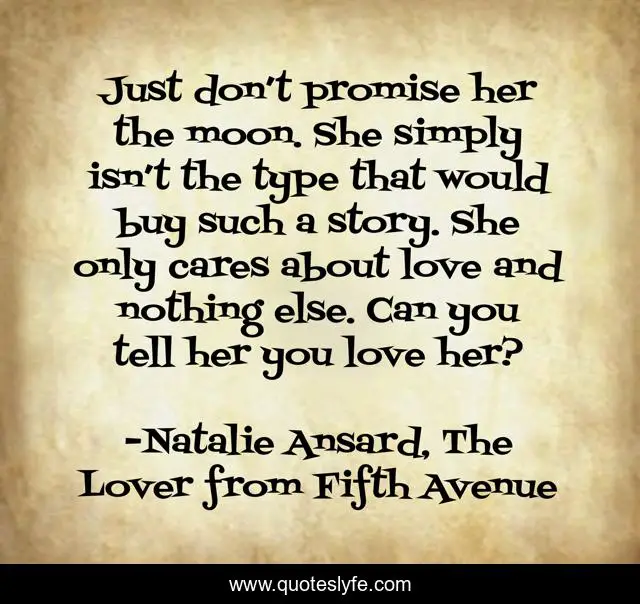 This page presents the quote "Just don’t promise her the moon. She simply isn’t the type that would buy such a story. She only cares about love and nothing else. Can you tell her you love her?". Author of this quote is Natalie Ansard, The Lover from Fifth Avenue. This quote is about love, love-story, affection, love-novel,.