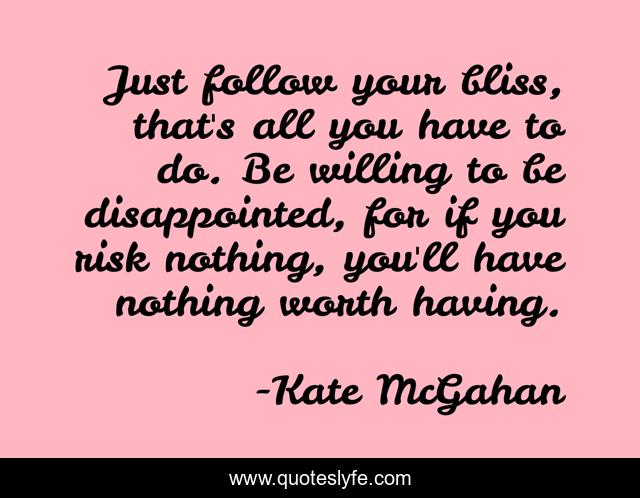 This page presents the quote "Just follow your bliss, that's all you have to do. Be willing to be disappointed, for if you risk nothing, you'll have nothing worth having.". Author of this quote is Kate McGahan. This quote is about goal, everything, bliss, nothing, reward, risk,.