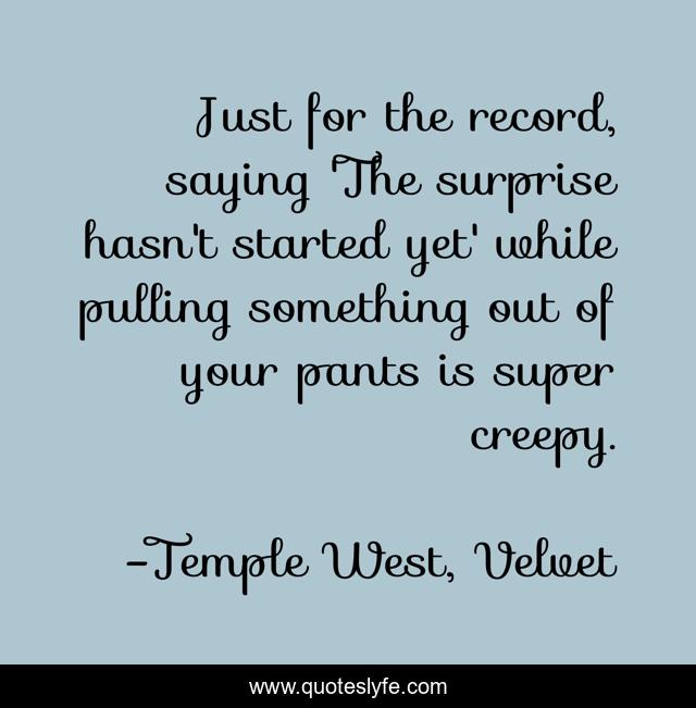 This page presents the quote "Just for the record, saying 'The surprise hasn't started yet' while pulling something out of your pants is super creepy.". Author of this quote is Temple West, Velvet. This quote is about blind-folds, vampires,.