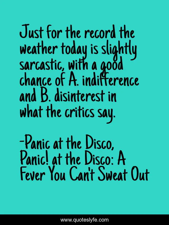 This page presents the quote "Just for the record the weather today is slightly sarcastic, with a good chance of A. indifference and B. disinterest in what the critics say.". Author of this quote is Panic at the Disco, Panic! at the Disco: A Fever You Can't Sweat Out. This quote is about sarcasm, humor,.