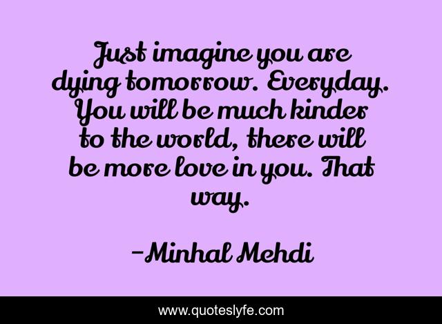 This page presents the quote "Just imagine you are dying tomorrow. Everyday. You will be much kinder to the world, there will be more love in you. That way.". Author of this quote is Minhal Mehdi. This quote is about kinf, love, die, favorite, tumblr, way, imagine, world, everyday,.