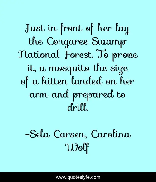 This page presents the quote "Just in front of her lay the Congaree Swamp National Forest. To prove it, a mosquito the size of a kitten landed on her arm and prepared to drill.". Author of this quote is Sela Carsen, Carolina Wolf. This quote is about contemporary-comedy, paranormal-romance, werewolves-paranormal-romance,.
