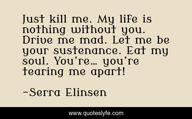 This page presents the quote "Just kill me. My life is nothing without you. Drive me mad. Let me be your sustenance. Eat my soul. You’re… you’re tearing me apart!". Author of this quote is Serra Elinsen. This quote is about the-room, serra-elinsen, cthulhu, awoken, riley-bay, h-p-lovecraft, young-adult, paranormal-romance, lovecraft,.