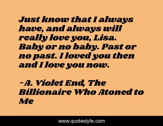 This page presents the quote "Just know that I always have, and always will really love you, Lisa. Baby or no baby. Past or no past. I loved you then and I love you now.". Author of this quote is A. Violet End, The Billionaire Who Atoned to Me. This quote is about true-love, first-loves, lost-baby,.