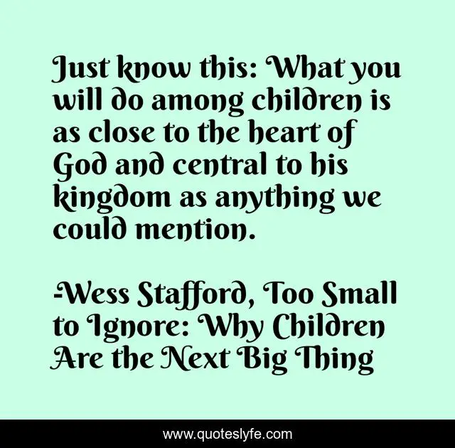 This page presents the quote "Just know this: What you will do among children is as close to the heart of God and central to his kingdom as anything we could mention.". Author of this quote is Wess Stafford, Too Small to Ignore: Why Children Are the Next Big Thing. This quote is about god, children, mission,.
