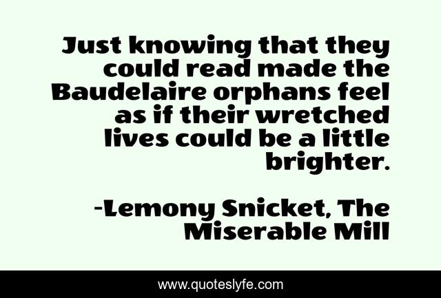 This page presents the quote "Just knowing that they could read made the Baudelaire orphans feel as if their wretched lives could be a little brighter.". Author of this quote is Lemony Snicket, The Miserable Mill. .