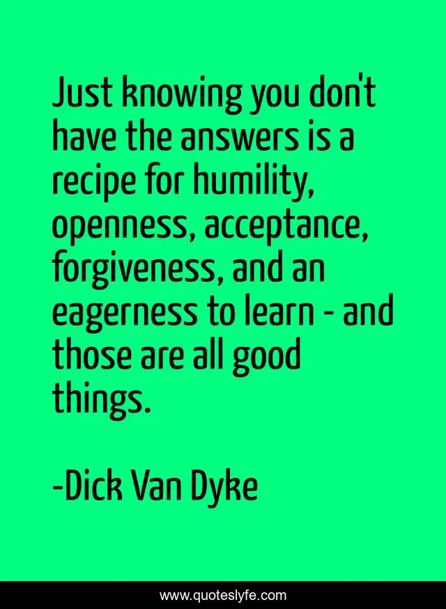 This page presents the quote "Just knowing you don't have the answers is a recipe for humility, openness, acceptance, forgiveness, and an eagerness to learn - and those are all good things.". Author of this quote is Dick Van Dyke. This quote is about forgiveness, humility,.