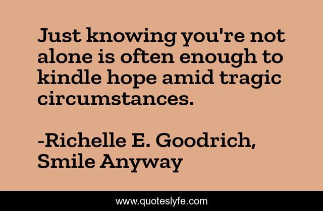 This page presents the quote "Just knowing you're not alone is often enough to kindle hope amid tragic circumstances.". Author of this quote is Richelle E. Goodrich, Smile Anyway. This quote is about not-alone, richelle-goodrich, richelle, tragedy, hope,.