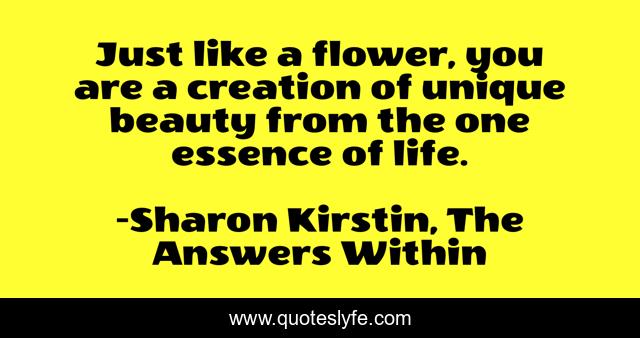 This page presents the quote "Just like a flower, you are a creation of unique beauty from the one essence of life.". Author of this quote is Sharon Kirstin, The Answers Within. This quote is about life, creation, beauty, positive, motivational, confidence, spiritual-power, spirituality, concretion,.
