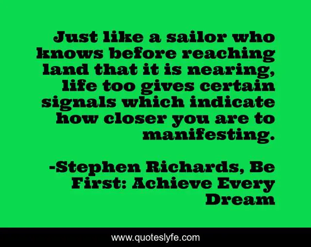 This page presents the quote "Just like a sailor who knows before reaching land that it is nearing, life too gives certain signals which indicate how closer you are to manifesting.". Author of this quote is Stephen Richards, Be First: Achieve Every Dream. This quote is about mind-body-spirit, confidence, money, wealth, self-help-book, wealth-creation, law-of-attraction, motivational, positive-thinking,.