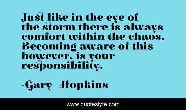 This page presents the quote "Just like in the eye of the storm there is always comfort within the chaos. Becoming aware of this however, is your responsibility.". Author of this quote is Gary Hopkins. This quote is about spiritual-growth, god, chaos, spirituality, oneness, energy-healing, obvious, inspirational, higher-self,.