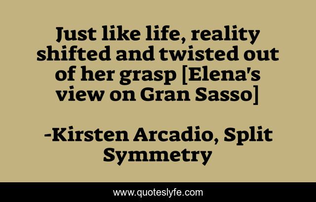 This page presents the quote "Just like life, reality shifted and twisted out of her grasp [Elena's view on Gran Sasso]". Author of this quote is Kirsten Arcadio, Split Symmetry. This quote is about italy, sci-fi, gran-sasso,.