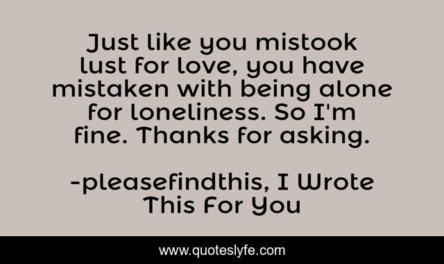 This page presents the quote "Just like you mistook lust for love, you have mistaken with being alone for loneliness. So I'm fine. Thanks for asking.". Author of this quote is pleasefindthis, I Wrote This For You. This quote is about being-alone, lust, loneliness, love, affection,.