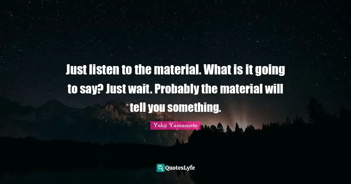 This page presents the quote "Just listen to the material. What is it going to say? Just wait. Probably the material will tell you something.". Author of this quote is Yohji Yamamoto. This quote is about waiting, materials, just listen,.