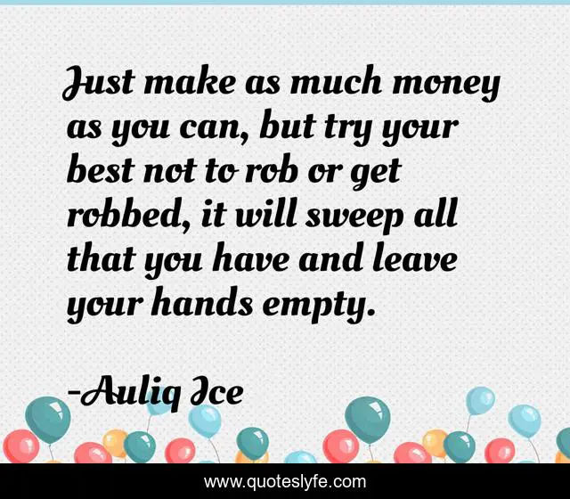 This page presents the quote "Just make as much money as you can, but try your best not to rob or get robbed, it will sweep all that you have and leave your hands empty.". Author of this quote is Auliq Ice. This quote is about money-management, job-seeking, salary, career, money, inspirational, career-development, talents, joblessness,.