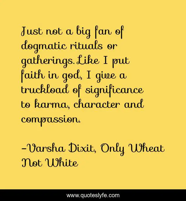 This page presents the quote "Just not a big fan of dogmatic rituals or gatherings. Like I put faith in god, I give a truckload of significance to karma, character and compassion.". Author of this quote is Varsha Dixit, Only Wheat Not White. This quote is about religion, life, india, family,.