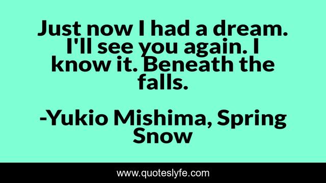 This page presents the quote "Just now I had a dream. I'll see you again. I know it. Beneath the falls.". Author of this quote is Yukio Mishima, Spring Snow. This quote is about dreams, fate,.
