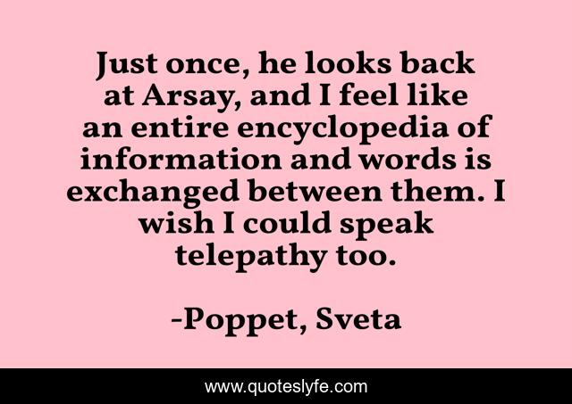 This page presents the quote "Just once, he looks back at Arsay, and I feel like an entire encyclopedia of information and words is exchanged between them. I wish I could speak telepathy too.". Author of this quote is Poppet, Sveta. This quote is about paranormal-romance, vampire-romance,.