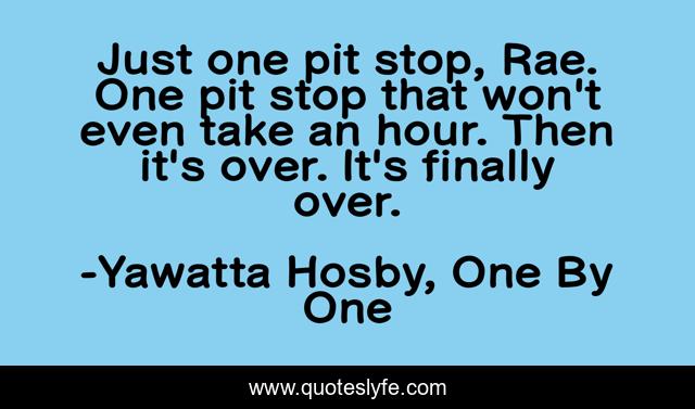 This page presents the quote "Just one pit stop, Rae. One pit stop that won't even take an hour. Then it's over. It's finally over.". Author of this quote is Yawatta Hosby, One By One. This quote is about horror, psychological-mindgames, thriller,.